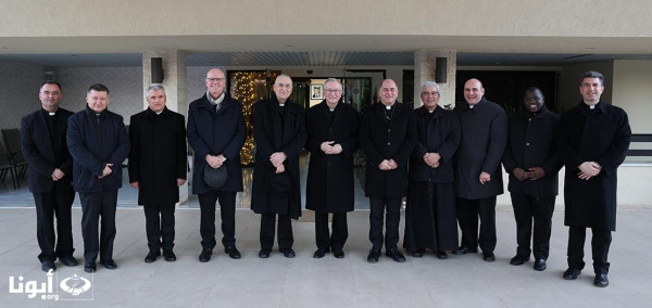 الكاردينال بارولين متوسطًا السفراء البابويين عقب الاجتماع (تصوير: أسامة طوباسي / أبونا)