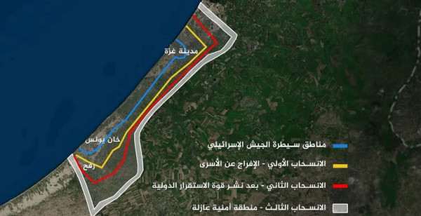 إذا وافق الطرفان على هذا المقترح، ستنتهي الحرب فورا. ستنسحب القوات الإسرائيلية إلى الخط المتّفق عليه للتحضير لإطلاق سراح الرهائن. في غضون ذلك، سيتمّ تعليق كلّ العمليات العسكرية، بما في ذلك القصف الجوّي والمدفعي، وستبقى خطوط القتال مجمّدة إلى أن يتمّ استيفاء الشروط للانسحاب الكامل على مراحل.