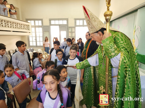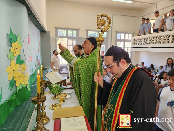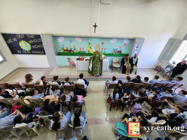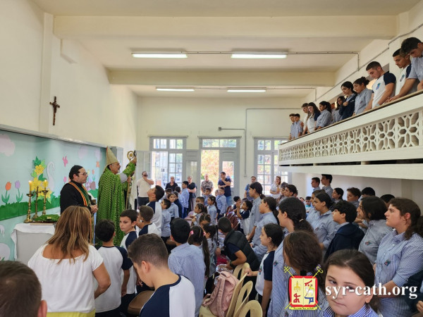 استُقبِل غبطته في المدرسة بحفاوة بنوية بالغة، وعلى أنغام نشيد استقبال رؤساء الأحبار. ثمّ احتفل بالقداس الإلهي بمشاركة المونسنيور حبيب مراد، والأب كريم كلش، وأعضاء الهيئة الإدارية، ومعلّمو التعليم المسيحي، وطلاب صفوف التعليم المسيحي في مختلف المراحل الدراسية، الروضة والإبتدائية والمتوسّطة والثانوية، والذين شاركوا بفرح كبير ولهفة وتأثُّر، خاصّةً وأنّها المرّة الأولى التي يحتفل فيها غبطته بالقداس الإلهي في مثل هذه المناسبة في المدرسة.