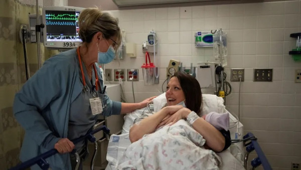 امرأة تحمل طفلها حديث الولادة في مستشفى بومونت بولاية ميشيجان الأميركية. 1 فبراير 2022 - REUTERS