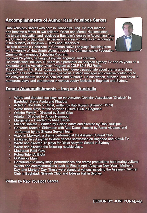 للكاتب الاستاذ يوسيفوس سركيس ، الكتاب يتالف من 293 صفحة ملونة مع الصور ، يشرح فيه المؤلف تاريخ المسرح الاشوري للفترة 1900 _ 2020 الميلادية في عددة دول و المدن التى يقطن فيها ابناء شعبنا.