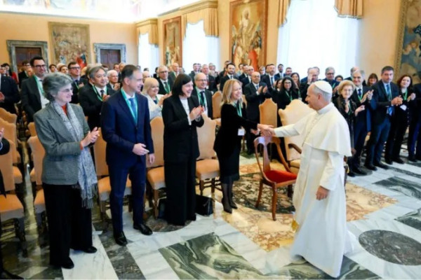 البابا لاوون الرابع عشر يلتقي في القصر الرسوليّ الفاتيكانيّ اليوم المشاركين في مؤتمر «الذكاء الاصطناعيّ ورعاية بيتنا المشترك» | مصدر الصورة: فاتيكان ميديا