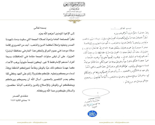 وجاء في وثيقة صادرة عن الصدر، أنه "نظراً للمصلحة العامة وإحياءً لصلاة الجمعة التي سُقيت بدماء الشهيد الصدر ونجليه، وإعلاءً لكلمة الدين والمذهب، أجد من الضروري إقامة صلاة موحدة في عموم العراق، ولتكن هذا العام في محافظة بابل العزيزة".