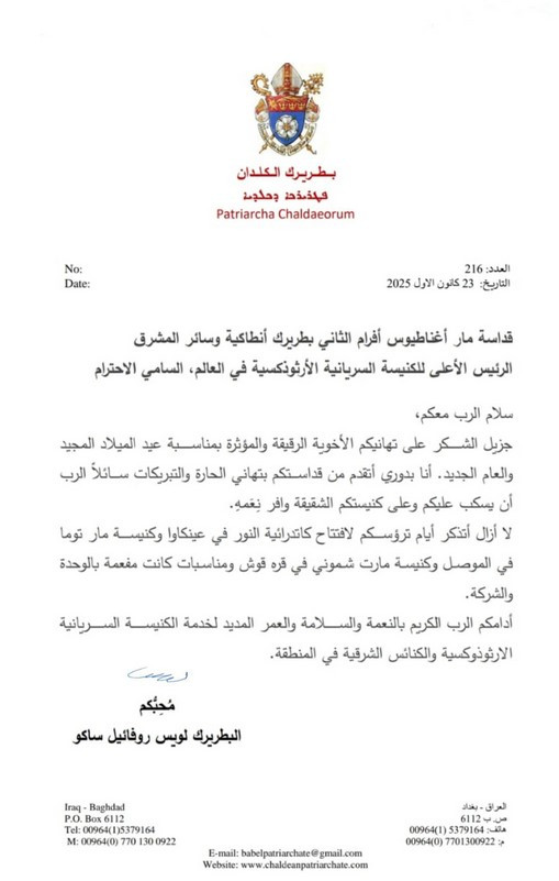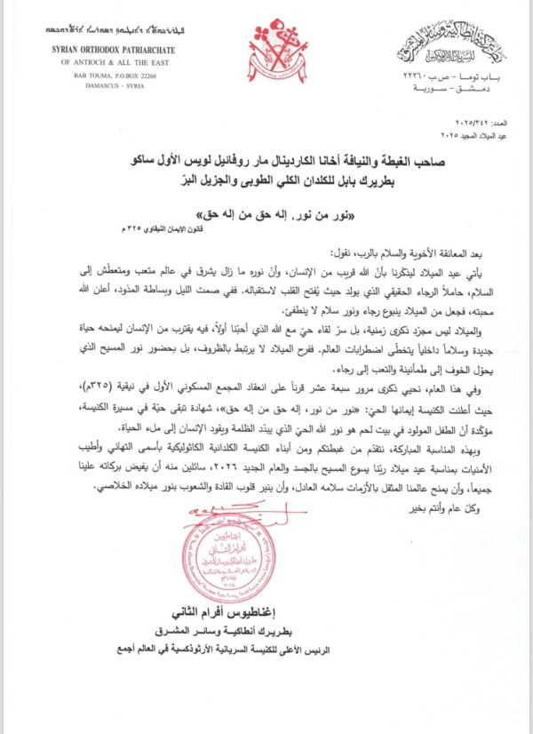 رسالة المعايدة الصادرة عن قداسة البطريرك مار إغناطيوس أفرام الثاني بمناسبة عيد الميلاد المجيد ٢٠٢٥