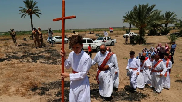 قداس لمسيحيين عراقيين في الموقع الأثري لكنيسة كوخي، جنوب بغداد، في 23 أغسطس/آب 2019. AP