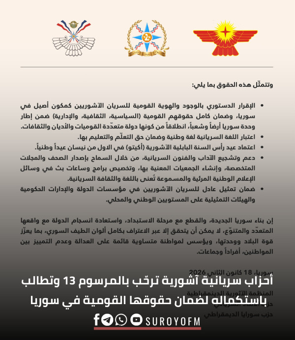 أصدر كل من حزب الاتحاد السرياني، والمنظمة الآثورية الديمقراطية، وحزب سورايا الديمقراطي بياناً مشتركاً، قالوا فيه إنهم تلقوا باهتمام وتقدير صدور المرسوم رقم /13/ لعام 2026 عن الرئيس السوري للمرحلة الانتقالية، أحمد الشرع بوصفه تطوراً مهماً في مسار الاعتراف الدستوري بالحقوق القومية والثقافية للمكونات السورية، وهنأت الشعب الكردي في سوريا على نيله هذه الحقوق التي جاءت ثمرة نضاله وتراكم عمله السياسي.