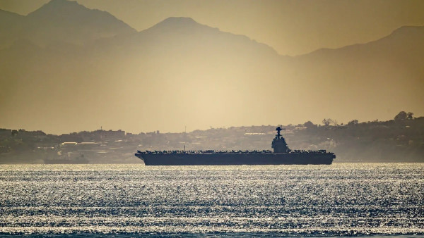 حاملة الطائرات الأميركية يو إس إس جيرالد فورد في مياه البحر كما تُرى من جبل طارق. 20 فبراير 2026 - Reuters