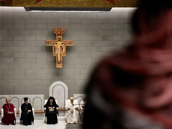 البابا فرنسيس يعقد اجتماعًا مسكونيًا وصلاة من أجل السلام في كاتدرائية سيدة الجزيرة العربية، في العوالي، البحرين، في 4 نوفمبر/تشرين الثاني 2022. رويترز/حمد محمد
