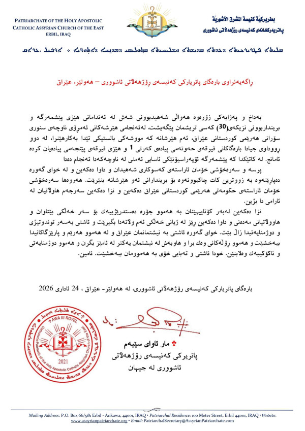 بيان صادر عن بطريركية كنيسة المشرق الآشورية – أربيل، العراق