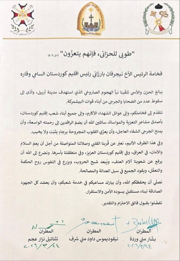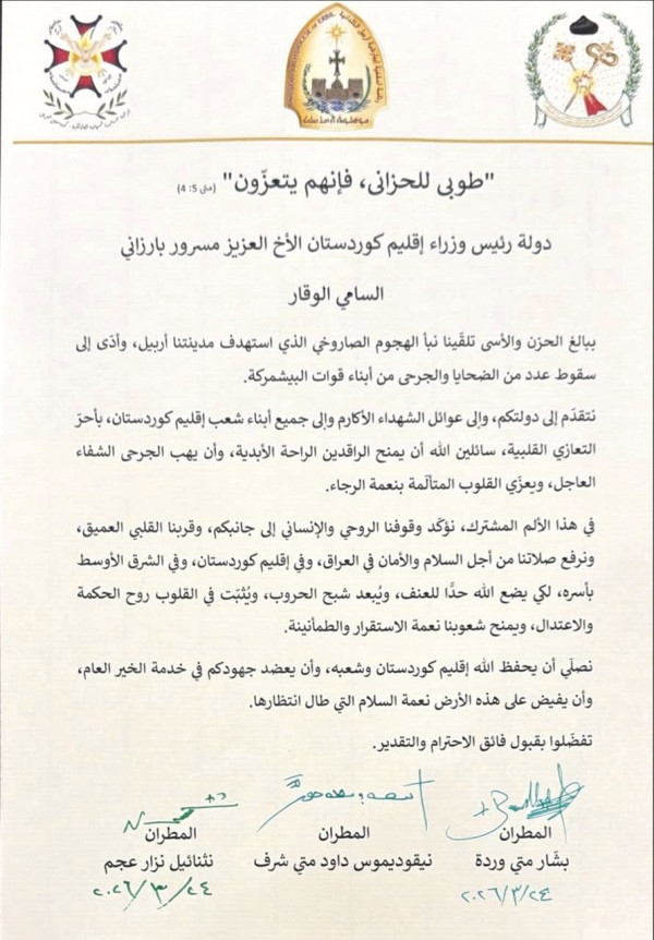 برقية تعزية من اساقفة أربيل الى فخامة رئيس أقليم كوردستان السيد نيجيرفان بارزاني و دولة رئيس وزراء أقليم كوردستان السيد مسرور بارزاني