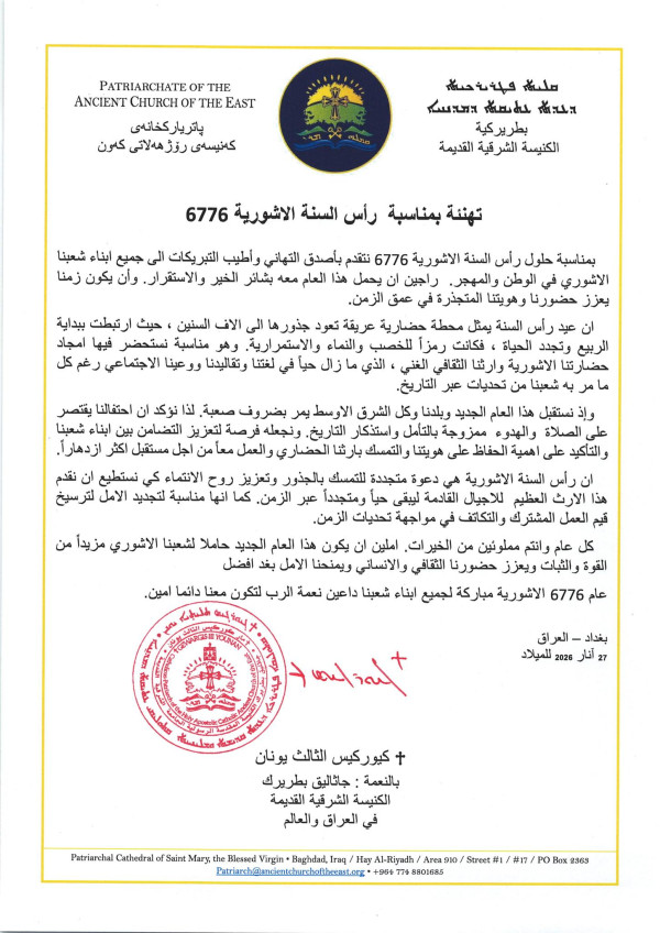 رسالة تهنئة من قداسة مار كوركيس الثالث يونان، جاثليق- بطريرك الكنيسة الشرقية القديمة، بمناسبة رأس السنة الآشورية ٦٧٧٦.