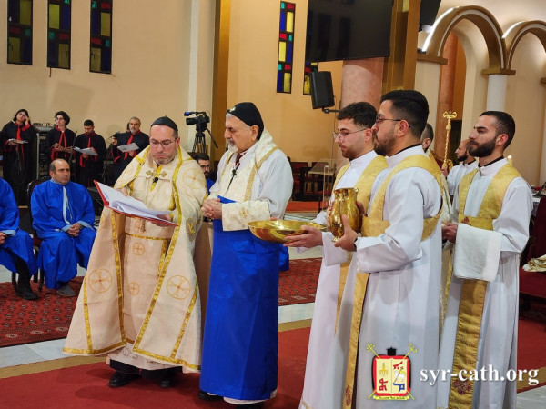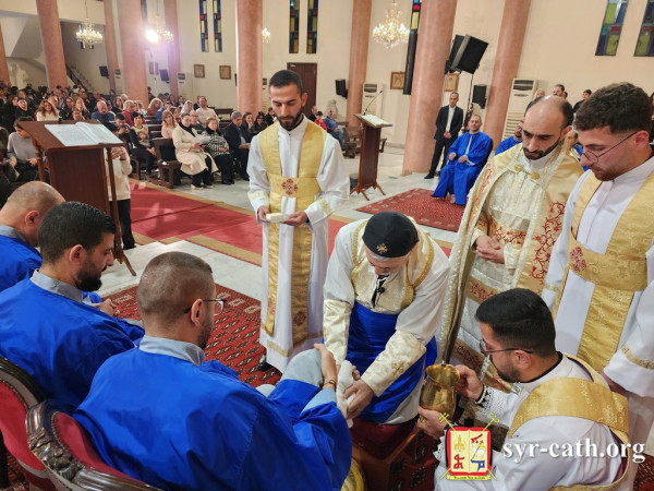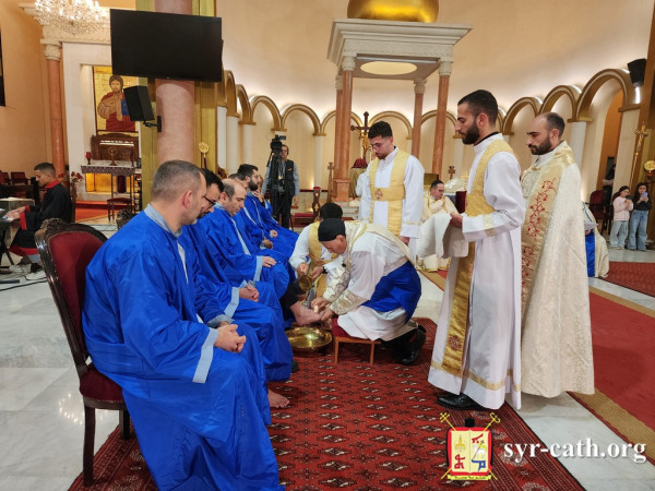 بدايةً ترأّس غبطته رتبة الغسل بحسب الطقس السرياني الأنطاكي، حيث قام بغسل أقدام 12 شخصاً من المؤمنين، يمثّلون تلاميذ الرب يسوع الإثني عشر. ثمّ احتفل غبطته بالقداس الإلهي بمناسبة خميس الفصح.