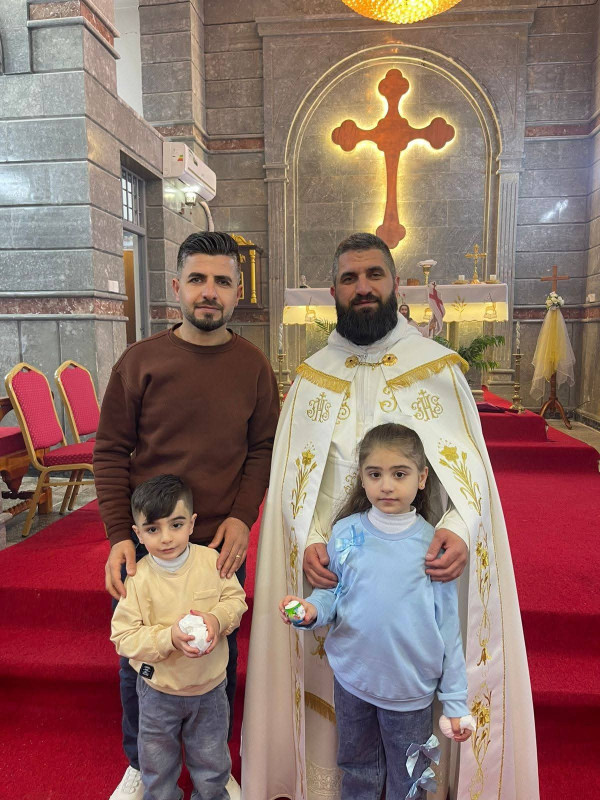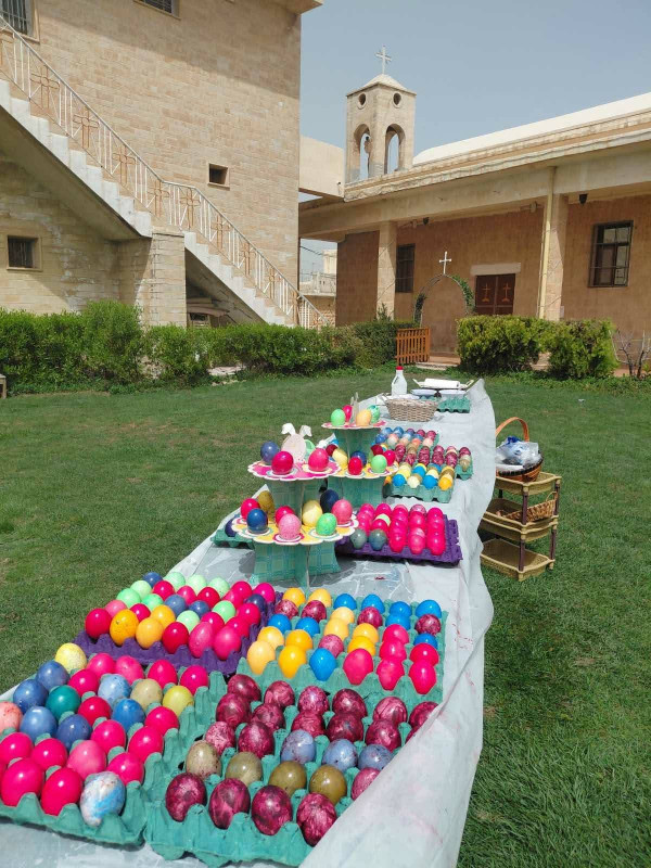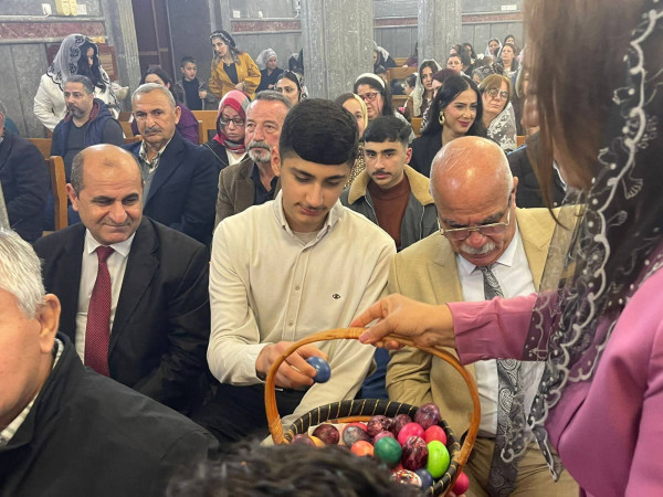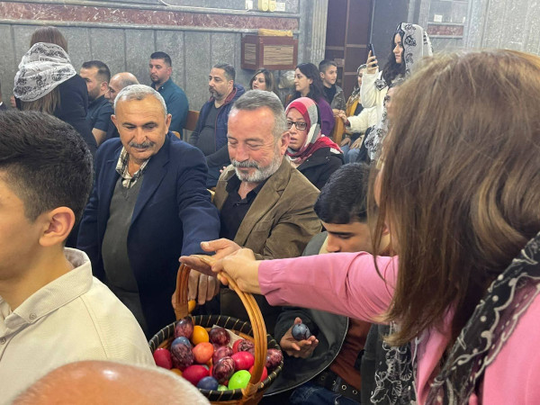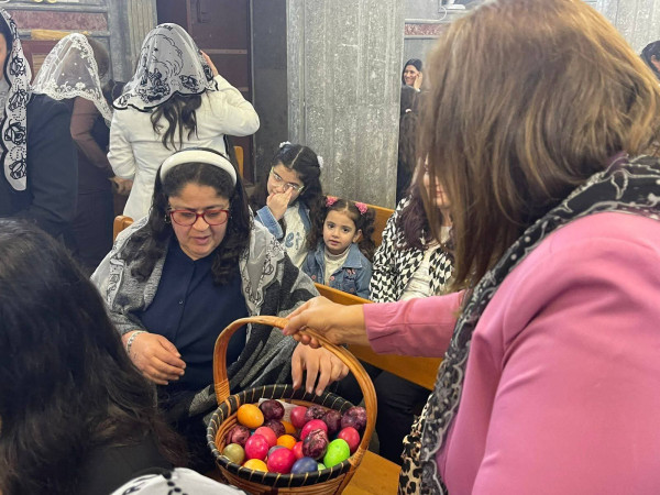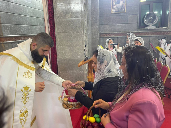 وفي ختام القداس، وضمن التقاليد الجميلة، قامت مجموعة من النسوة بتوزيع البيض الملون على الحاضرين. واختتمت الاحتفالية بتبادل التهاني في باحة الكنيسة في مشهد يجسد وحدة الصف والمحبة المتجذرة ، حيث حرص أبناء الرعية على التقاط الصور التذكارية مع الأب الراعي ومع بعضهم البعض، لتوثيق هذه اللحظات الإيمانية التي جمعت العائلات في أجواء من الوحدة والمحبة، قبل أن يودعهم الأب سليمان ببركة العيد، داعياً أن يعيده الله على الجميع بالخير والبركات.