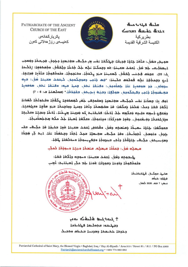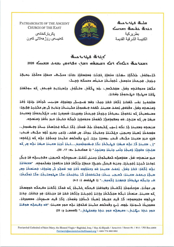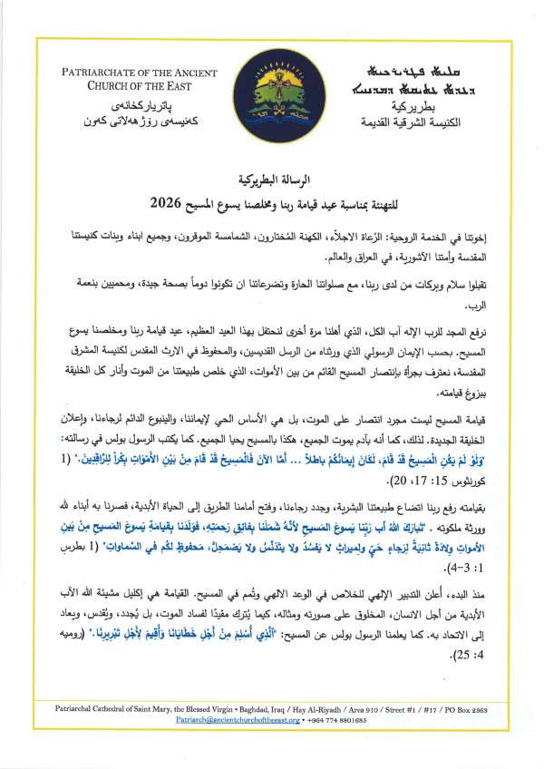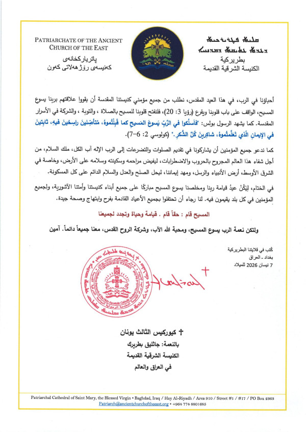 رسالة قداسة مار كيوركيس الثالث يونان، جاثليق بطريرك الكنيسة الشرقية القديمة في العراق والعالم، بمناسبة عيد قيامة ربنا ومخلصنا يسوع المسيح - صدرت عن مقر البطريركية في بغداد، العراق