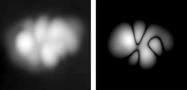 صورة لكثافة المدارات الإلكترونية في جزيء نصف-موبيوس الجديد (يسار)، وصورة محاكاة لكثافة المدارات للجزيء (جامعة مانشستر)