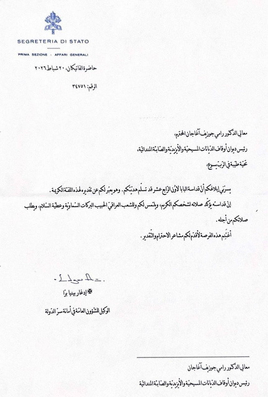 هكذا تلقى معالي رئيس ديوان أوقاف الديانات المسيحية والإيزيدية والصابئة المندائية، الدكتور رامي جوزيف آغاجان، رسالة قداسة البابا لاون الرابع عشر، عبّر فيها اولاً صلاته لشخص رئيس الديوان وكذلك عن قربه الروحي وصلاته ذاكراً من أجل (الشعب العراقي الحبيب).