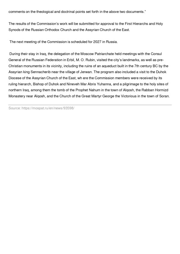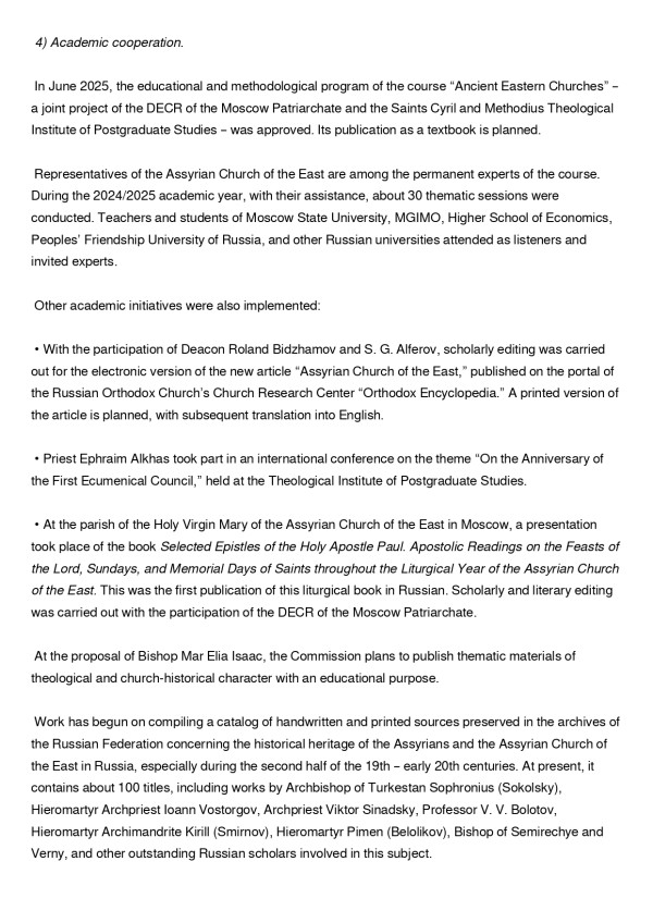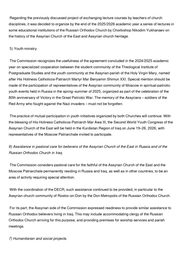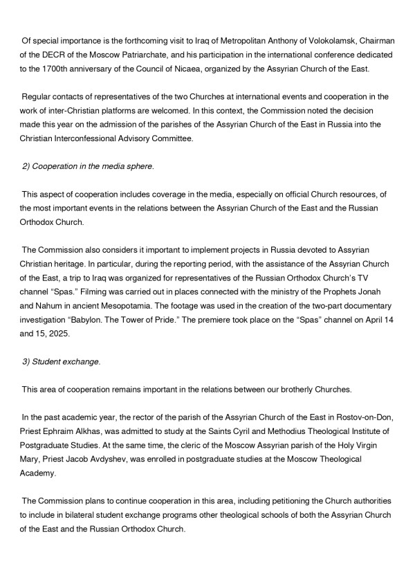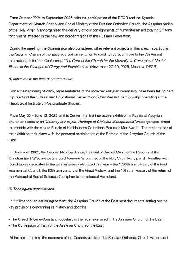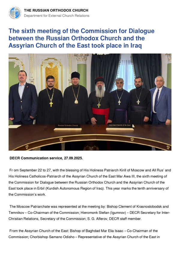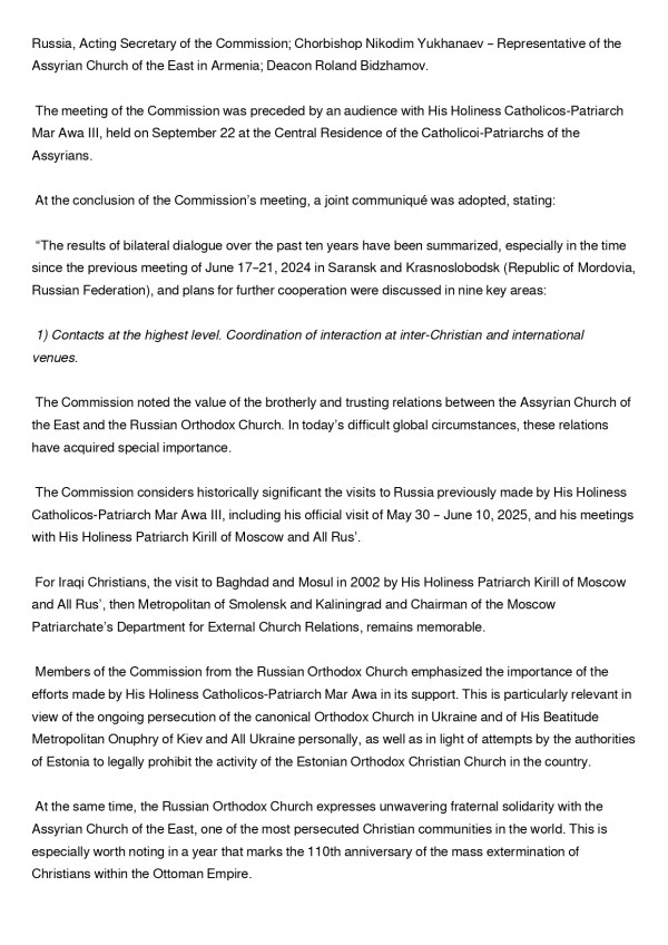 News: The final communiqué of the sixth annual meeting of the Bilateral Dialogue Commission between the Assyrian Church of the East and the Russian Orthodox Church