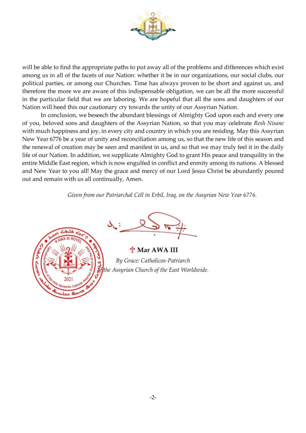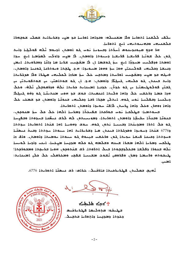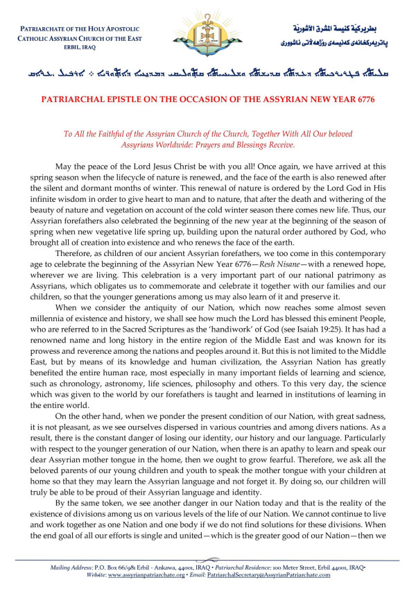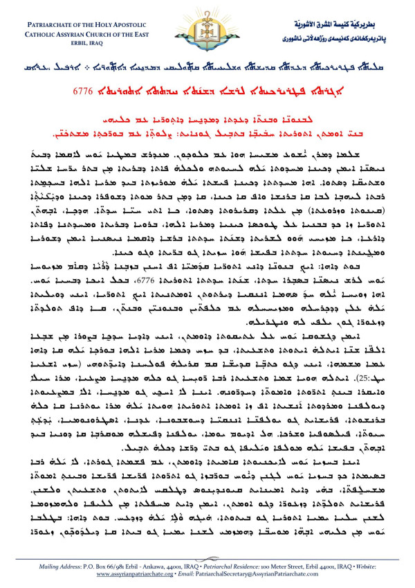 ܐܓܪܬܐ ܦܛܪܝܪܟܝܬܐ ܕܩܕܝܫܘܬܗ ܕܐܒ݂ܘܢ ܡܥܠܝܐ ܡܪܝ ܐܒ̣ܐ ܬܠܝܬܝܐ، ܩܬܘܠܝܩܐ ܦܛܪܝܪܟܐ ܕܥܕܬܐ ܕܡܕܢܚܐ ܕܐܬܘܪ̈ܝܐ ܒܥܪܐܩ ܘܬܒܝܠ، ܒܦܘܪܤܐ ܕܪܫܐ ܕܫܢ݇ܬܐ ܐܬܘܪܝܬܐ ܚܕܬܐ 6776.