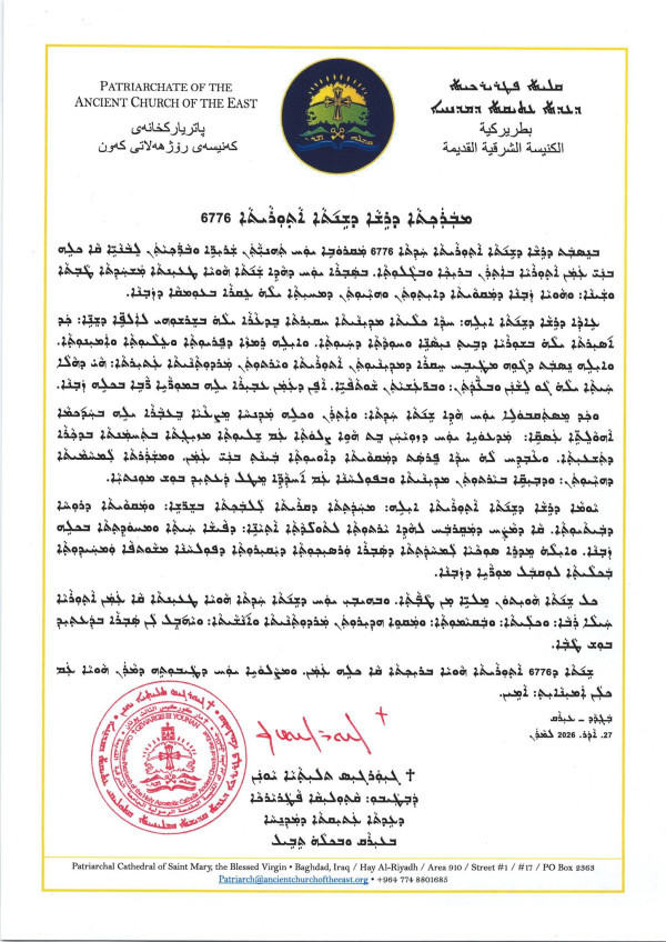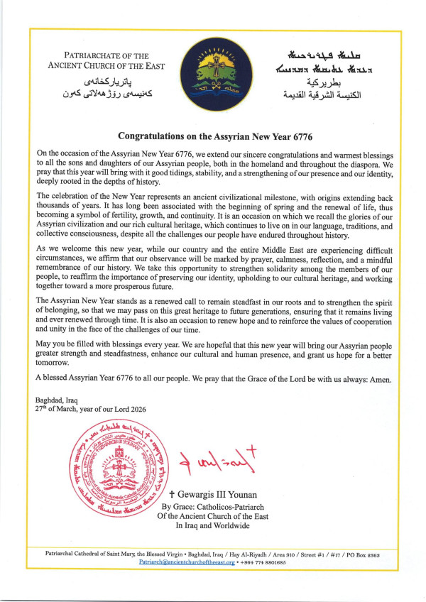 News: A congratulatory letter from His Holiness Mar Gewargis III Younan on the occasion of the Assyrian New Year 6776