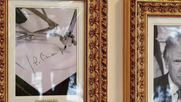 صورة لقلم آلي ينسخ توقيع جو بادين معلّقة، بدلاً من صورة الرئيس الأميركي السابق الشخصية، في "ممشى المشاهير الرئاسي" في البيت الأبيض في واشنطن (نقلاً عن وكالة "رويترز")