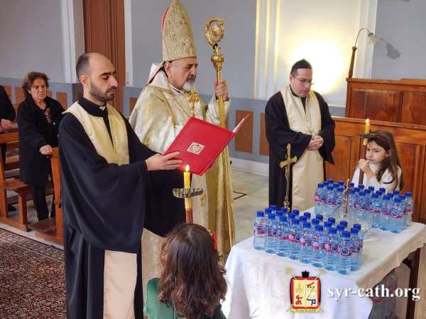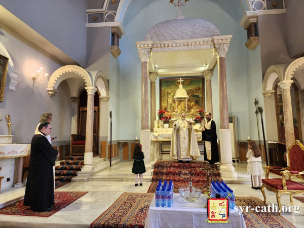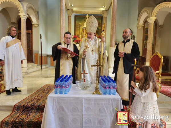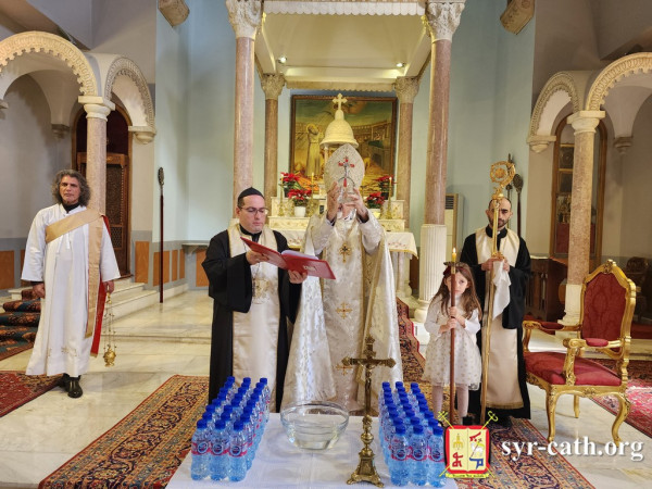 في بداية القداس، أقام غبطة أبينا البطريرك رتبة عيد الدنح وتبريك المياه بحسب الطقس السرياني الأنطاكي، فبارك غبطته المياه المهيَّئة كي يأخذها المؤمنون للبركة، والصحّة نفساً وجسداً وروحاً، والحماية من المضرّات، ونيل النِّعَم والمعونات. ثمّ أقام غبطته بركة الجهات الأربع بالصليب المقدس والمياه المبارَكة.