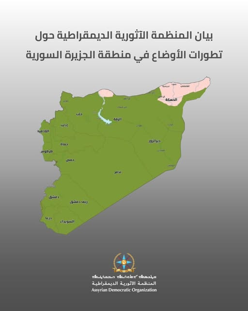 إن المنظمة الآثورية الديمقراطية إذ ترحب بهذا الإعلان الهام الذي من شأنه وقف نزيف الدم السوري، فإنها تتابع باهتمام بالغ ودقيق تطورات الأحداث في منطقة الجزيرة السورية، بما فيها مناطق تواجد ابناء شعبنا السرياني الآشوري في الخابور والقامشلي والحسكة والمالكية والقحطانية، وما يرافقها من توترات عسكرية وانعكاسات مجتمعية قد تمسّ السلم الأهلي وتقوّض أمن واستقرار المنطقة وتؤذي مكونات المنطقة.