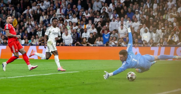 وعلى ملعب سانتياغو برنابيو، احتفل فينيسيوس الذي سجل هدف الفوز ذهابا وأُوقف الأرجنتيني جانلوكا بريستياني لاعب وسط بنفيكا بسببه، بعد ادعاء أنه وجّه إهانة عنصرية إليه، بحسم تأهل بطل أوروبا 15 مرة بتسجيله هدف الفوز في المباراة الثانية.