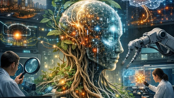 صورة تعبيرية صممتها "الشرق" باستخدام الذكاء الاصطناعي لتوضيح اتجاه جديد لباحثي الذكاء الاصطناعي لدراسة النماذج الذكية باعتبارها كائنات حية - Asharq