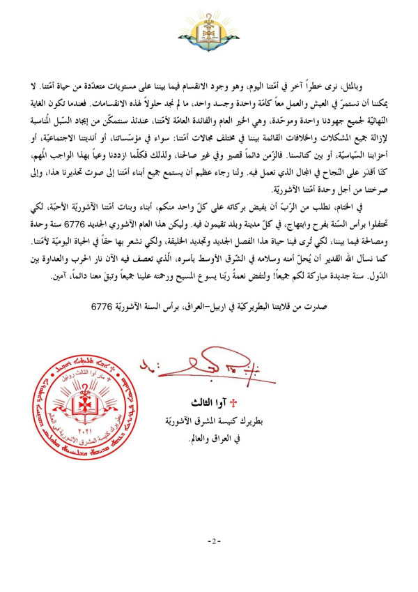 الرسالة البطريركيّة لقداسة ابينا البطريرك مار آوا الثالث، بطريرك كنيسة المشرق الآشوريّة في العراق والعالم، لمناسبة رأس السنة الآشوريّة الجديدة 6776.