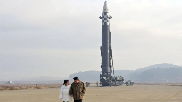 زعيم كوريا الشمالية كيم جونج أون مع ابنته أمام صاروخ باليستي عابر للقارات في صورة نشرتها وكالة أنباء كوريا الشمالية. 19 نوفمبر 2022 - REUTERS