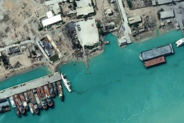 سفينة انقلبت عقب شن غارات جوية على قاعدة بوشهر البحرية في جنوب إيران (أ ف ب)