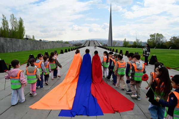 أطفال يزورون نصباً تذكارياً لضحايا الإبادة الأرمنية في يريفان، في 23 أبريل الحالي (أ ف ب)