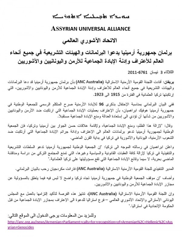 برلمان جمهورية ارمينا يدعو البرلمانات والهيئات التشريعية في العالم الى الاعتراف وادانة الابادة الجماعية للارمن واليونانيين والاشوريين