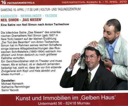ومرة أُخرى يبرز العراقي (samir yacoob) في موهبته المتميّزة والتي يضعها في الكفة الأُخرى من الميزان، وهو يمثل شخصية منظف الشارع الغريب عن المجتمع الذي يتمكن من إختراق الواجهة ورؤية ما خلف الستار منقذاً الأب من موقف ووضع لا يحسد عليه وهذا ليس بالغريب عليه وهو المخرج المسرحي الذي درس فن الإخراج في العراق، بلد الأصل، لقد مللأ هذا العرض المسرحي ذلك المساء، وأشبع عقول وقلوب المتفرجين الذين كافأوه بموجه عالية وطويلة من التصفيق.." هذا هو الفنان القادم من العراق والذي أجبر الأكف أن تصفق له.