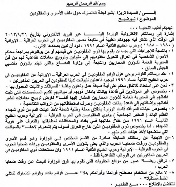 نضع بين أياديكم الكريمة التعليمات التي وصلتنا من وزارة حقوق الانسان رداً على أستفساراتنا واستفساراتكم حول كيفية التواصل في موضوع الاسرى والمفقودين، والكشف عن مصيرهم، وتنظيمهم في ملفات وزارة حقوق الانسان، لاجل ان يكونوا حاضرين عندها، ويكون للوزارة الاتصال بأهالي الاسرى والمفقودين.