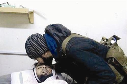 قبلة على جبينه بعد مقتله من هادي العبدالله الناطق باسم الثورة في الداخل