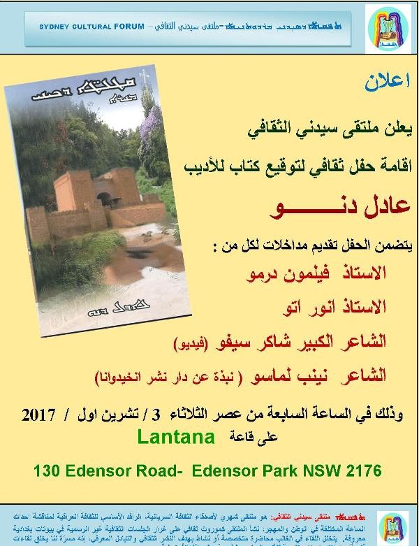 اعلان من تفقتا سيدني : حفل توقيع كتاب للشاعر عادل دنو